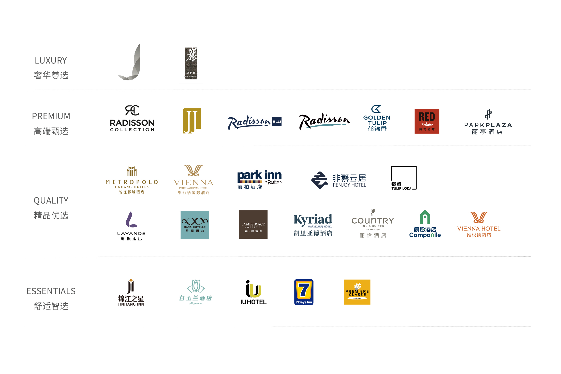 Jinjiang Hotels (China) currently has several hotels under its umbrella, including Lirui, Jinjiang Metropolis, Vienna International, Libo, Hilton Garden Inn, Fengdu, Yuantuo, Shuyu, ZMAX, Lifeng, Xian, Zhefei, Kyriade, Liyi, Camplatinum, Vienna, Chaoman, Taorui, Jinjiang Inn, Magnolia, IU, 7 Days Inn, Xingge, Yunju, QUEST, Jingli, Binyue and Tu The synergy effect of brand aircraft carriers such as Ling and other diverse hotel and apartment brands is gradually emerging.